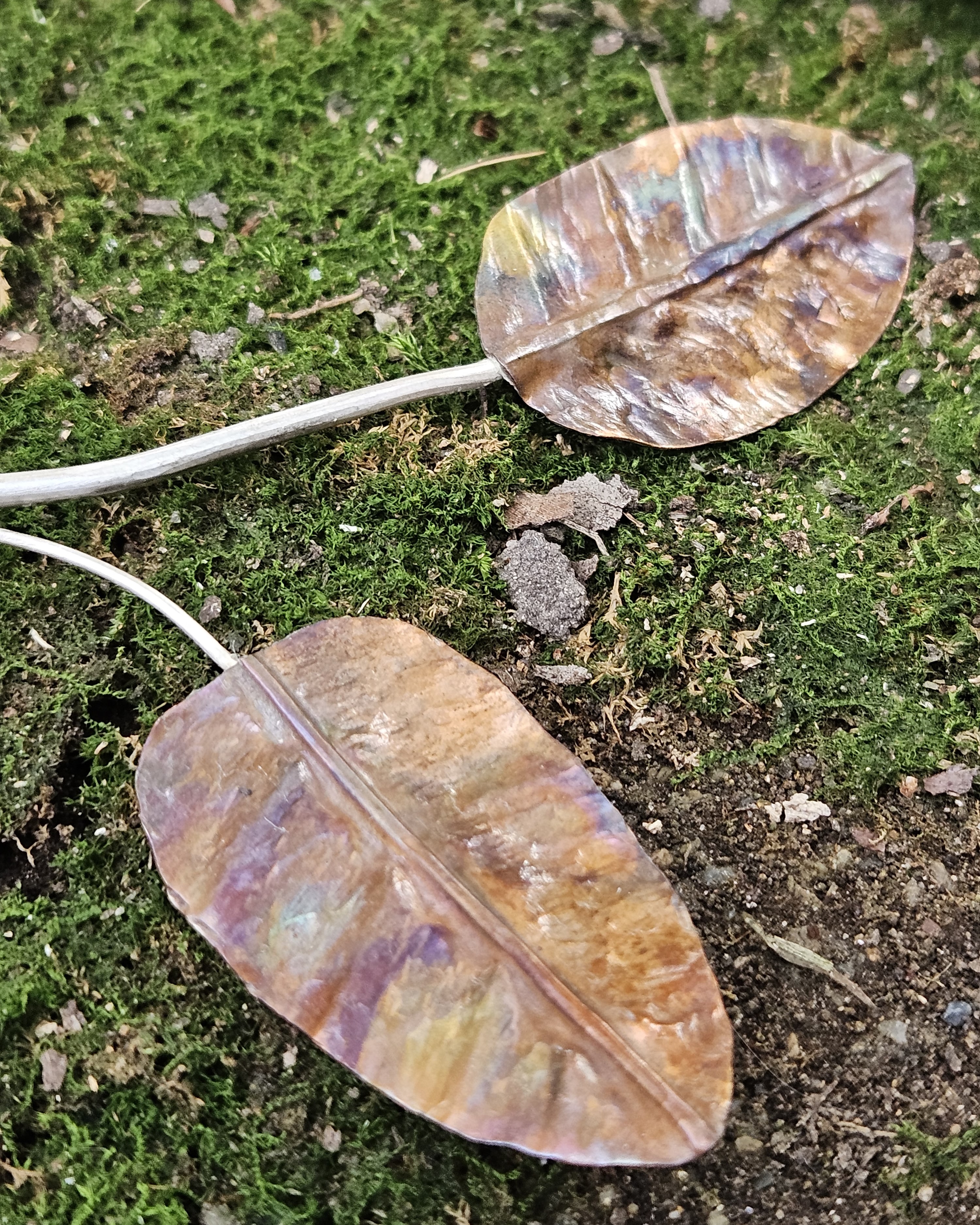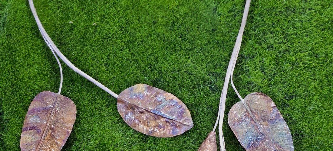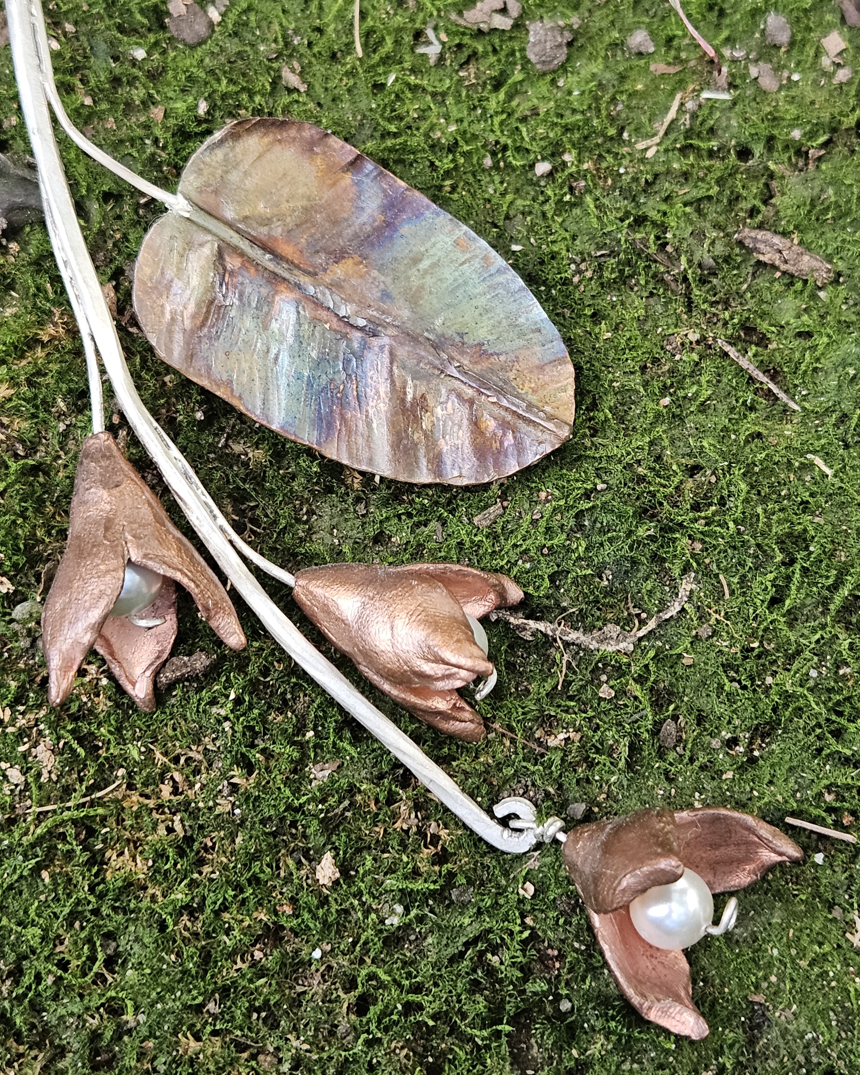 This torque is made from hand forged, fire-painted copper leaves; copper gumnuts shaped from modelling wax and set with glass pearls inside; finished off with a hand forged, argentum silver stem forming the neck of the piece. Truly a work of art.