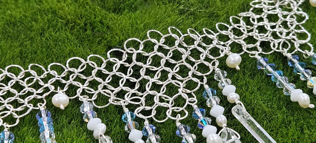 My Crystals and Ice Chainmail Choker is made from .9mm sterling silver wire. Each ring hand made, placed, and soldered by me into this lovely 4 in 1 chainmail design. Added to the choker are Swarovski crystal beads in clear and blues, freshwater pearls, and quartz crystal points. This design in particular reminds me of clear icy mornings right after a big snowfall, the ice and fresh snow blanketing the world.
