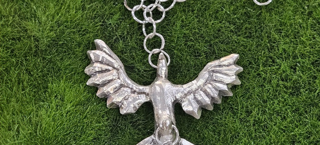 This phoenix is hand carved from wax and then cast in sterling silver. Not an ordinary phoenix made of fire but one born of ice and crystal. She carries in her claws a shard of amethyst in a hand fabricated, sterling silver setting. The choker is hand made from .9mm wire. A 4-in-1 chainmail pattern with each link soldered shut for strength.