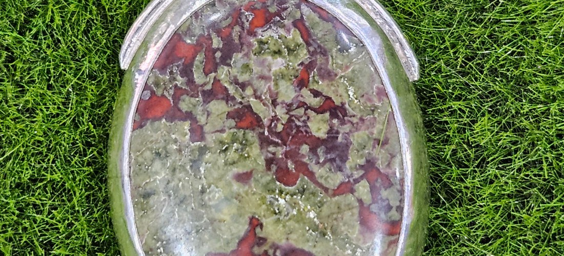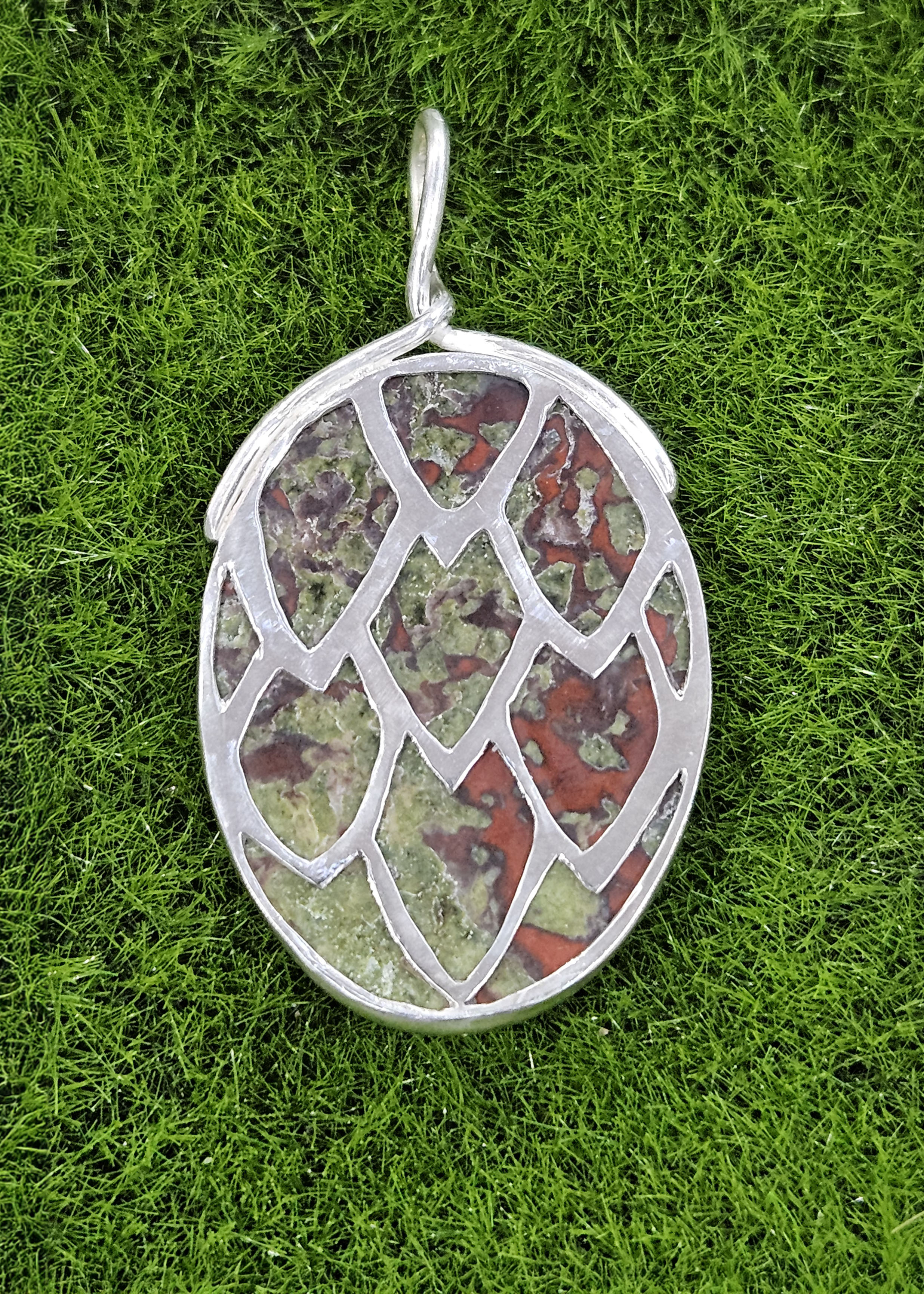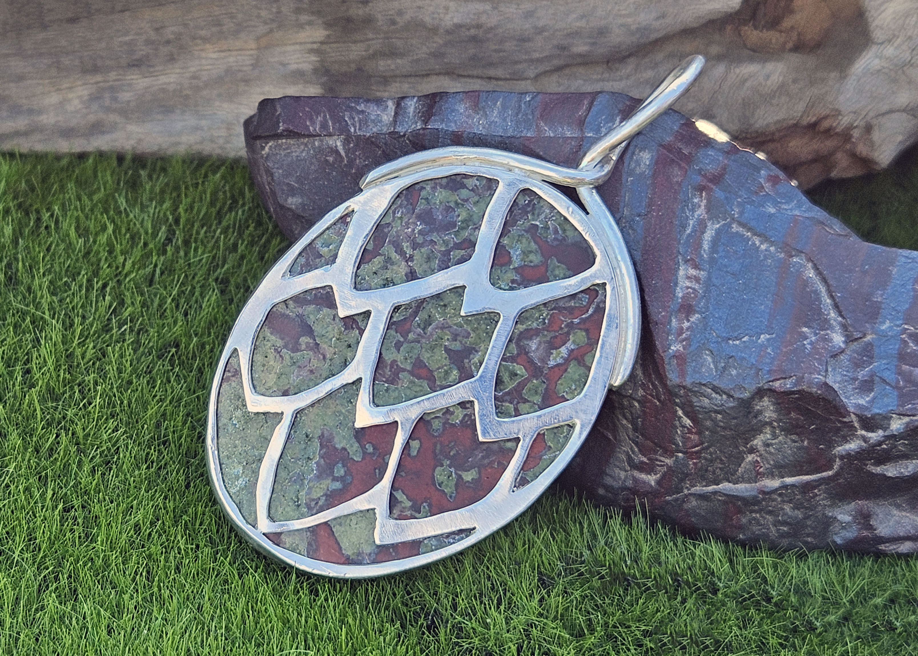 This large Dragon Blood Jasper is set in sterling silver with a fine silver bezel. On the reverse is a dragon scale cut-out that is reminiscent of a dragon’s egg.