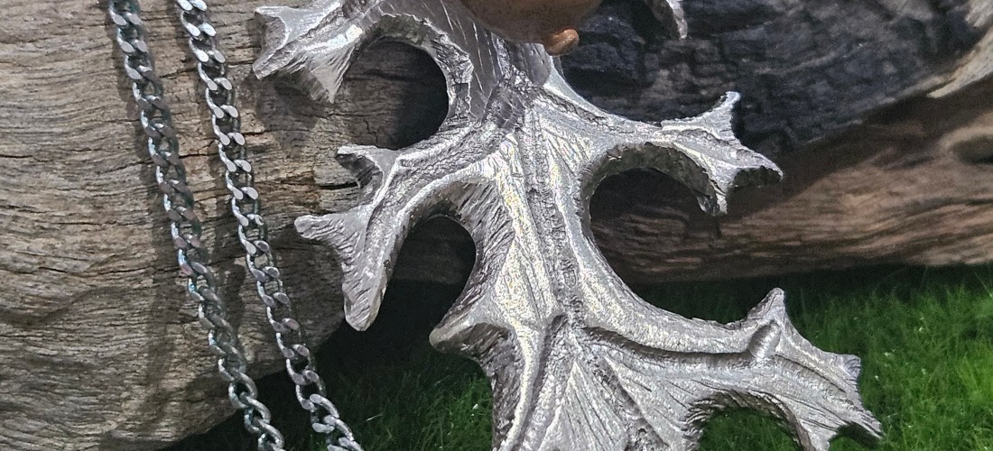 This oak leaf is hand carved from wax and then cast in sterling silver while the acorn was cast in copper. Where I grew up, there were lots and lots of oak trees and now that I’ve moved away, I miss them. So I made myself a memory… of oak leaves and acorns.