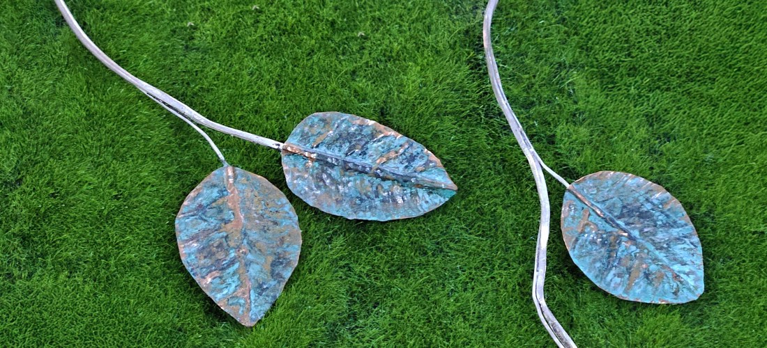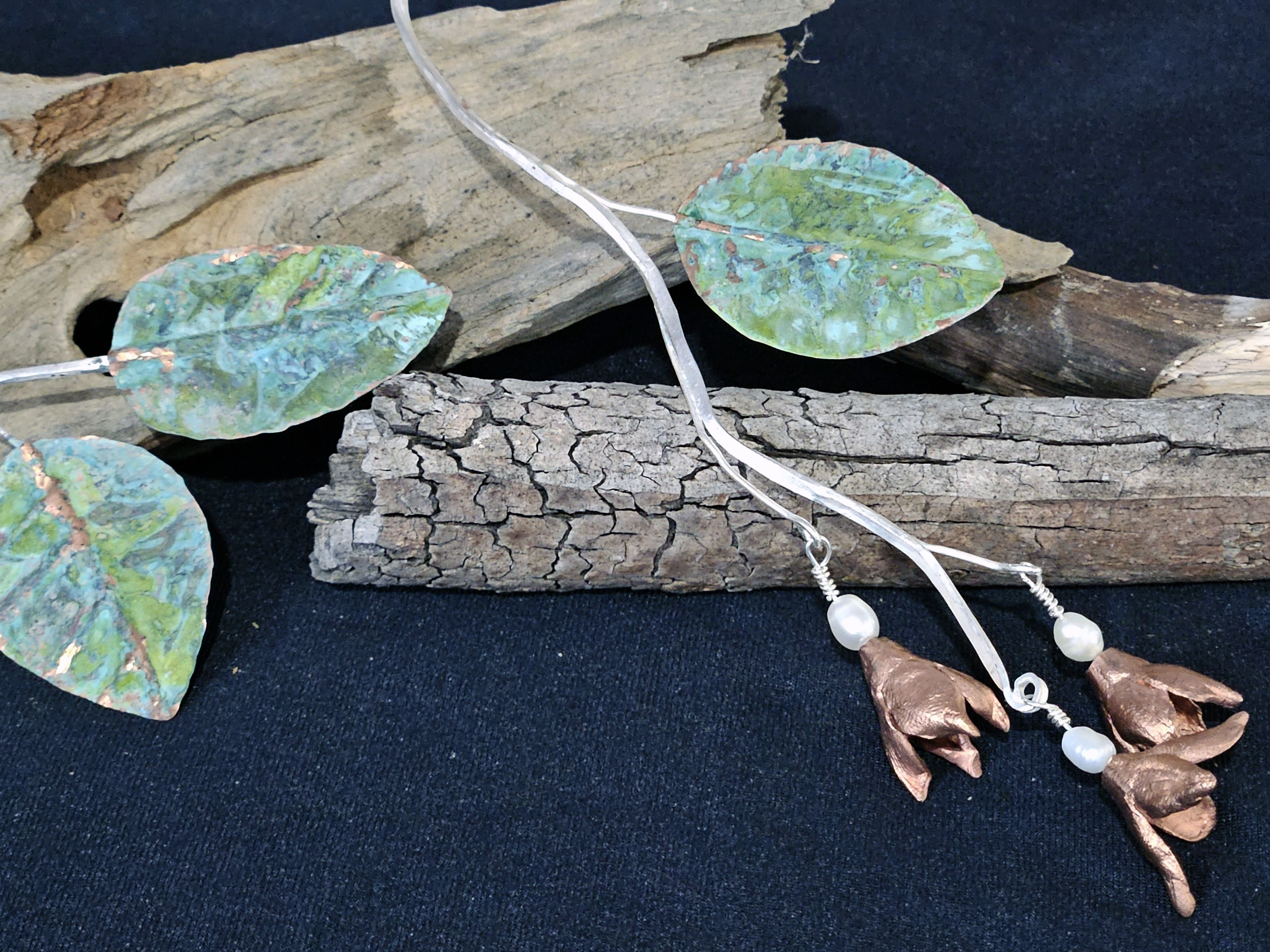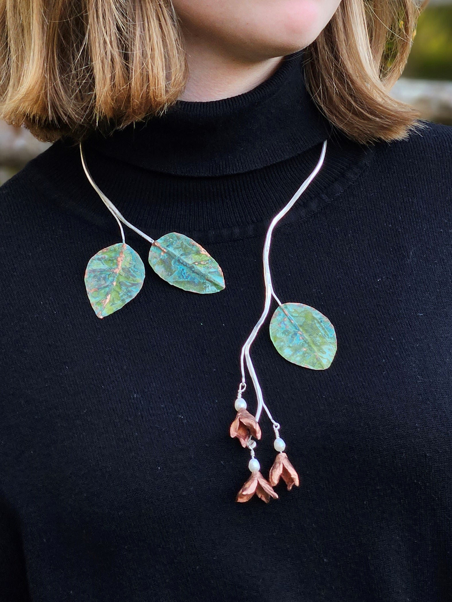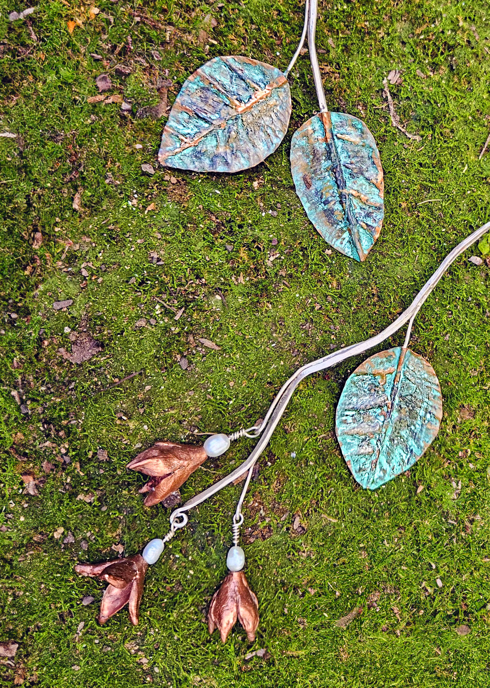 Forged copper leaves with a green patina; wax formed, bright copper cast flowers with fresh water pearl bases; and a hand forged, argentum silver branch connecting it all together make up this gorgeous art piece. Reminiscent of flowering trees in the spring, it’s sure to make a statement wherever it’s worn.