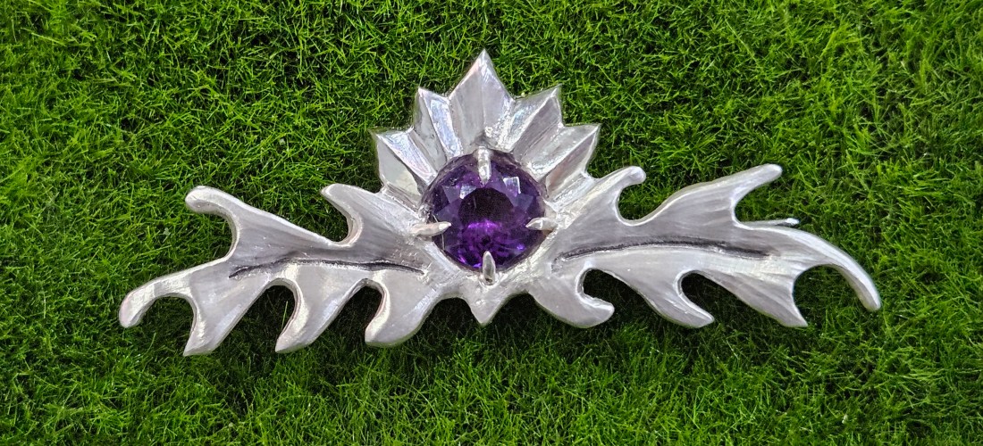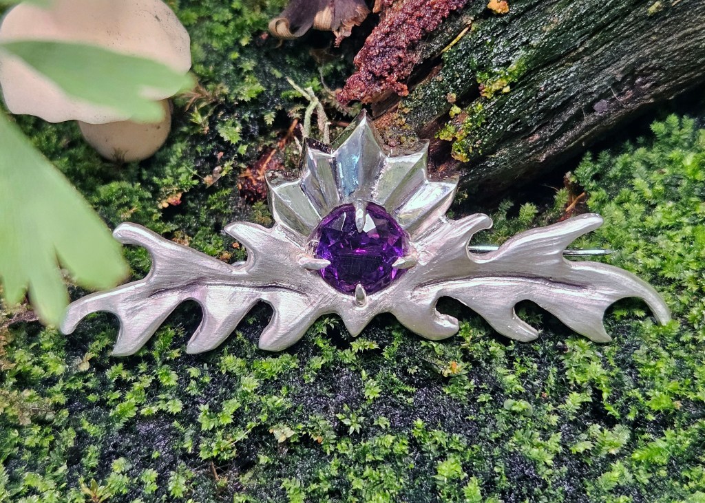 Carved from wax and cast into sterling silver then set with an octagonal amethyst. This brooch has a real Celtic Art Nouveau flair.