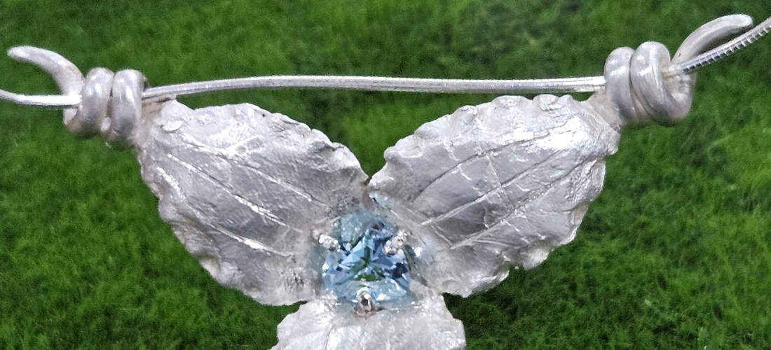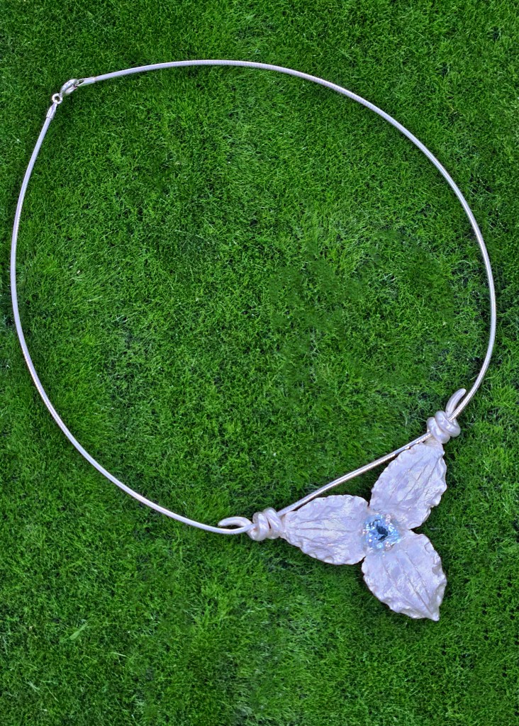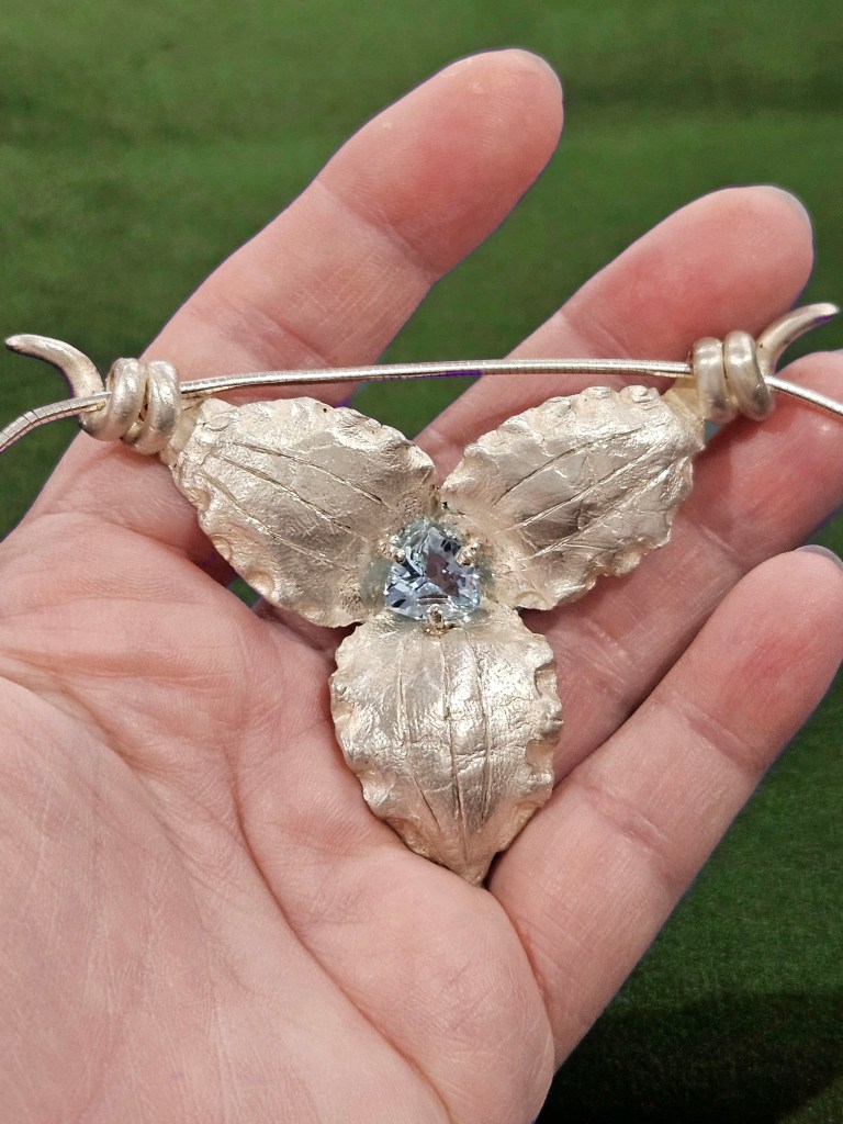 Springtime flowers bring fields of trilliums down by the river banks. This particular trillium flower was formed in wax and cast in sterling silver. There is a brilliant blue topaz trillion set in the centre.