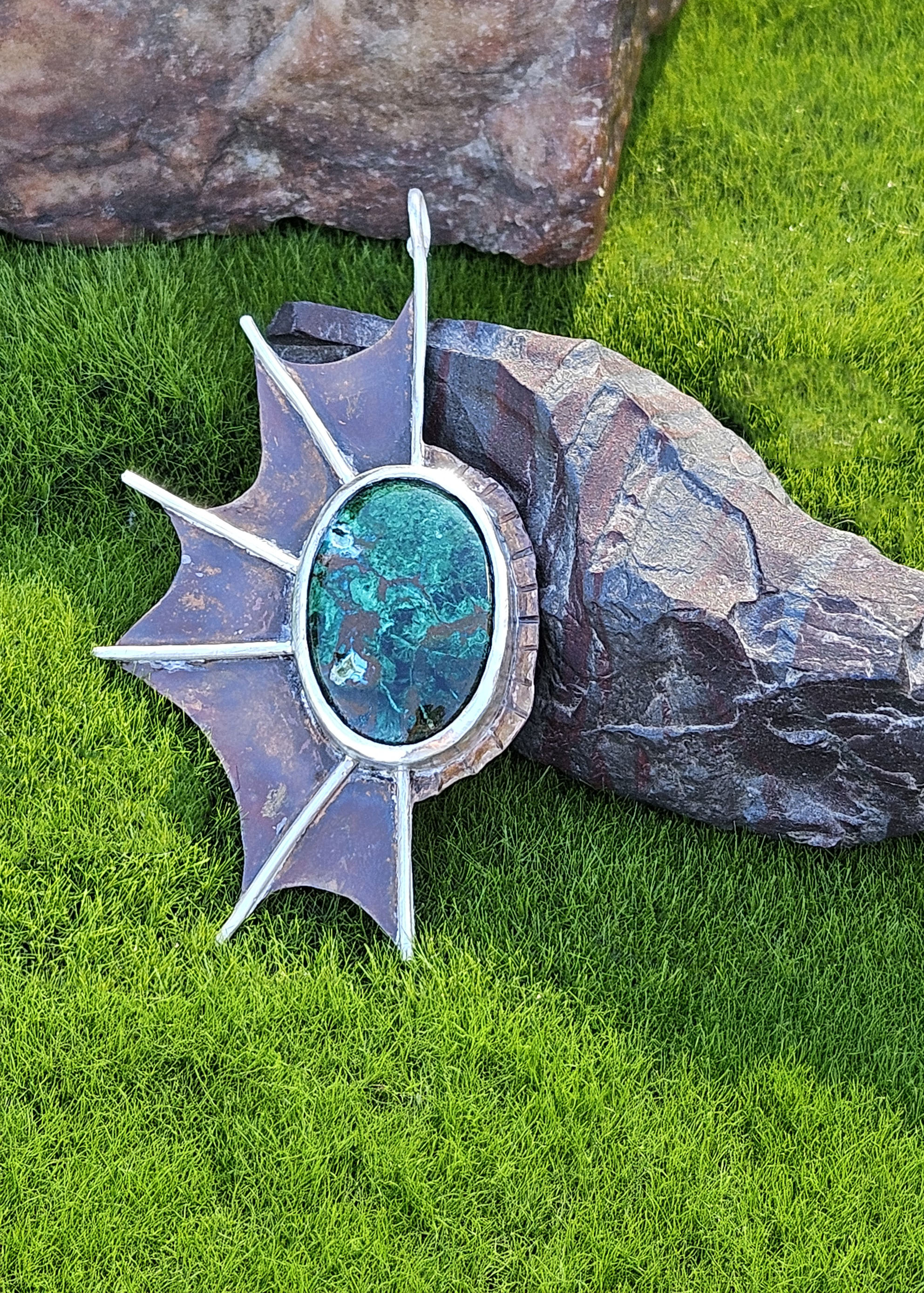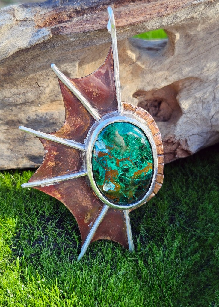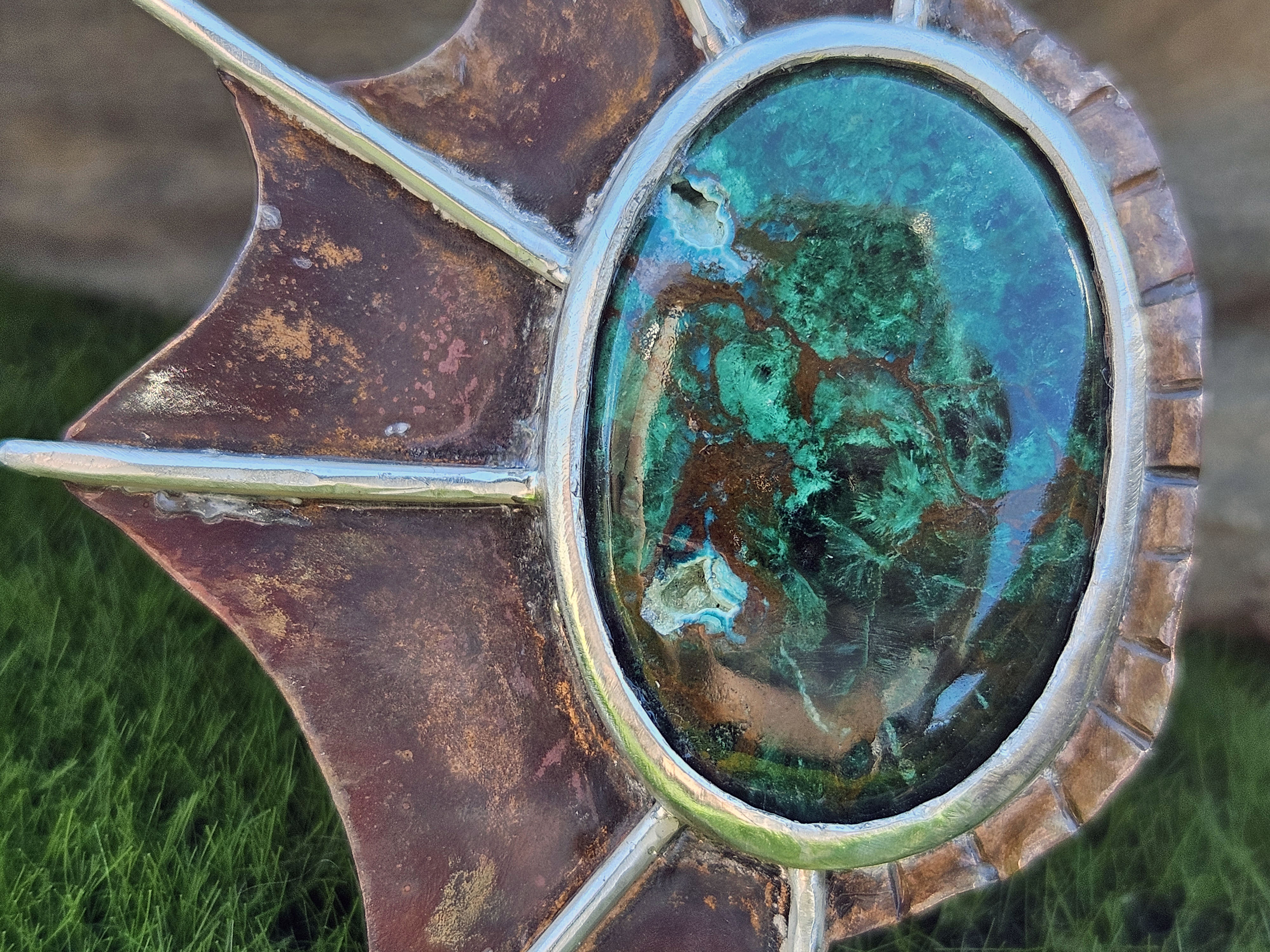 This is a large chrysocholla with copper veining set in a flame-painted copper setting with a sterling silver bezel and accent wires. With the copper flares or webbing this piece looks just like a dragon’s eye while on it’s side.