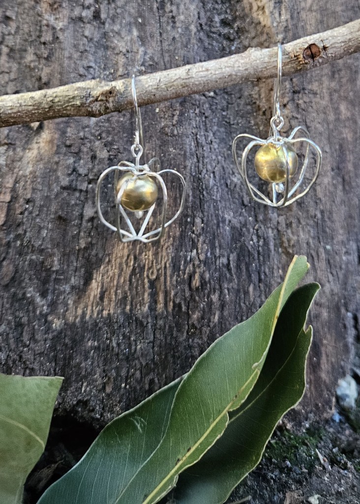 These earrings feature hollow brass balls encaged in a sterling silver wire cage dangling from a sterling silver hook. Reminiscent of the seed casing of a Chinese Lantern ornamental plant. One of my favourite floral peculiarities while growing up, they just ignite the imagination in form and function.