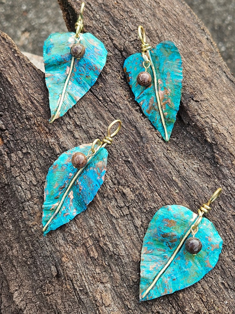 Hand Forged copper leaves with a variety of finishes. Some fire-painted, some with a verdigris patina, and some unfinished. Each leaf has a brass stem and some form of either jasper or Chrysocolla bead accent. One of my favourite things to do with copper, make leaves from every season.