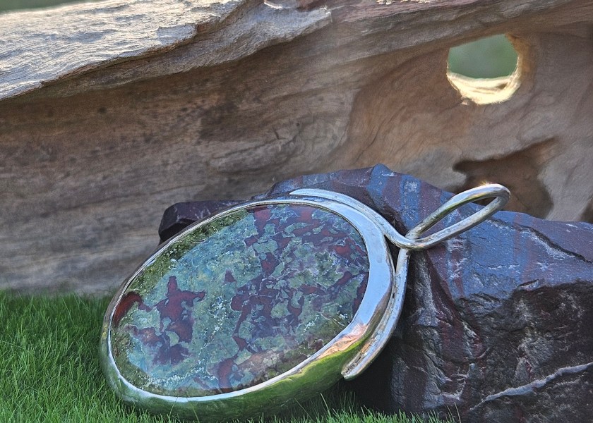 This large Dragon Blood Jasper is set in sterling silver with a fine silver bezel. On the reverse is a dragon scale cut-out that is reminiscent of a dragon’s egg.