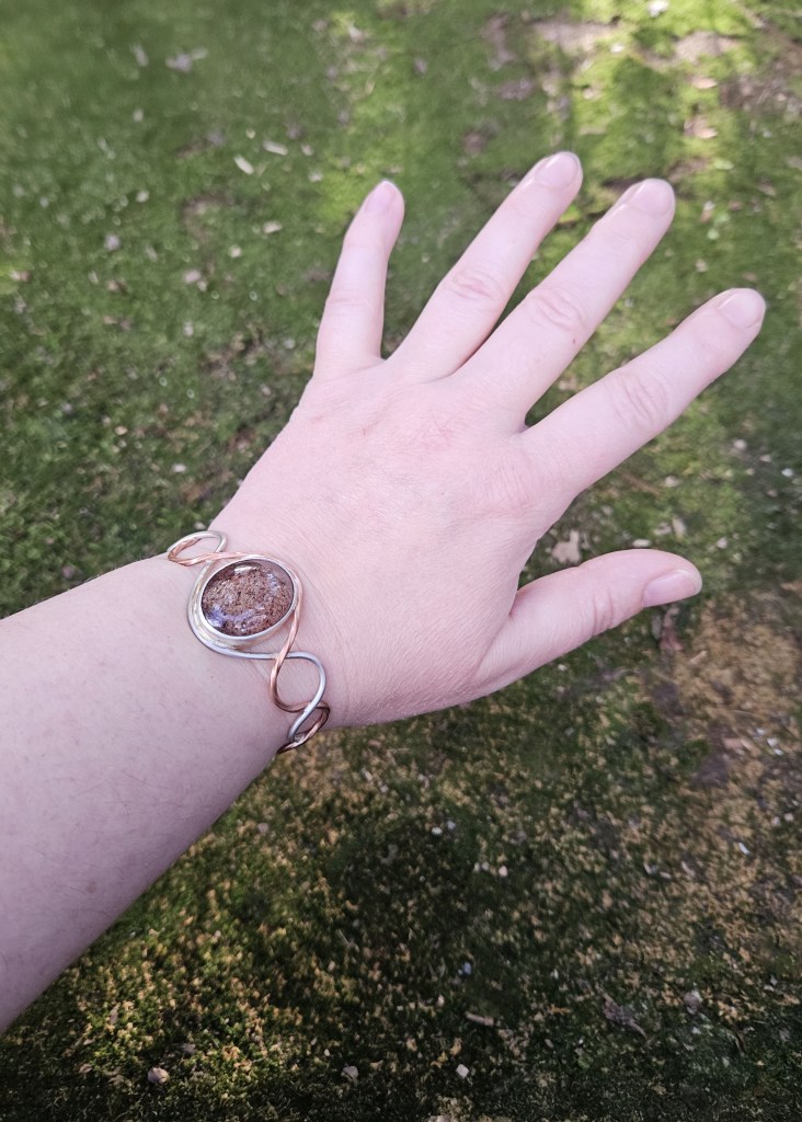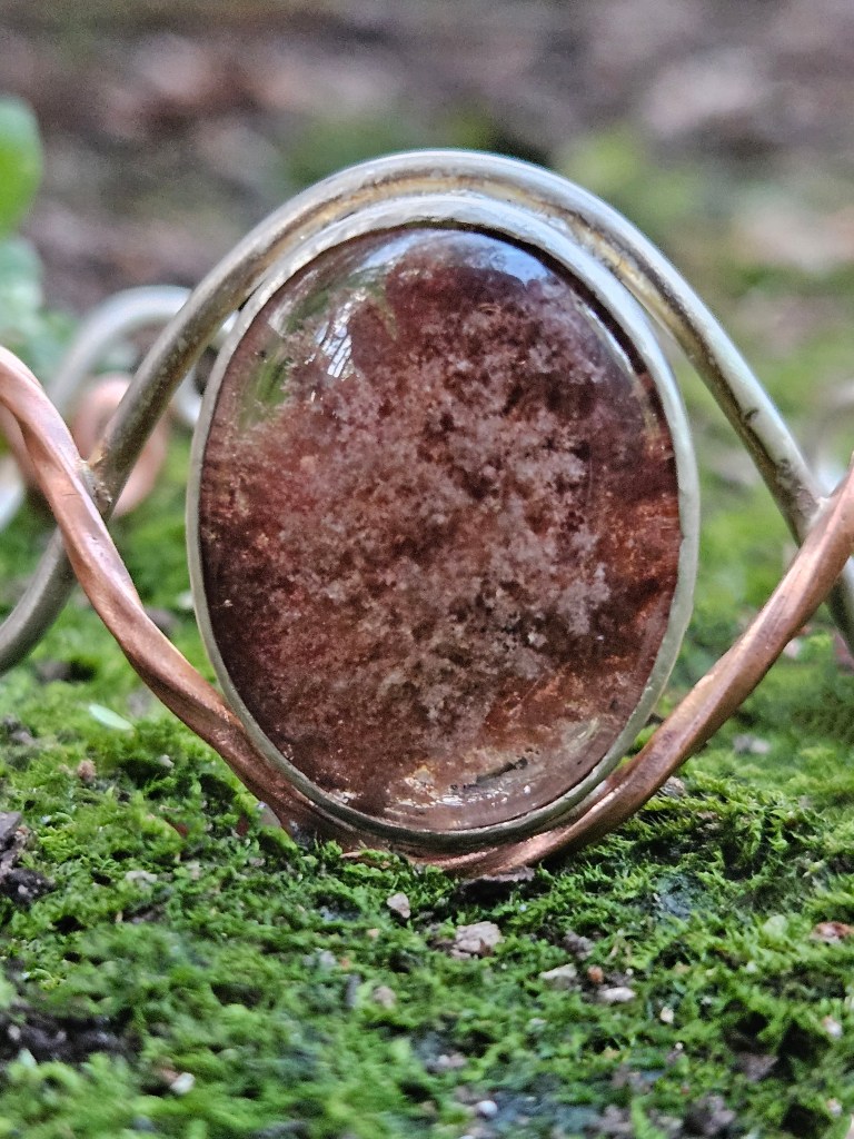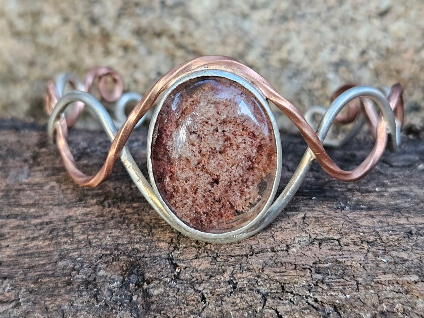 Sterling silver wire and twisted copper wire in an open braid make up the base of this bracelet, while set in the centre is a beautiful Lodite Quartz. It is bezel set in sterling silver with an open back, so that you can really appreciate the hidden world within. An explosion of mineral can be seen in the crystal clear quartz. It reminds me of lazy summer days, looking up at the clouds, and imagining different shapes and places. This is a stone for dreamers.