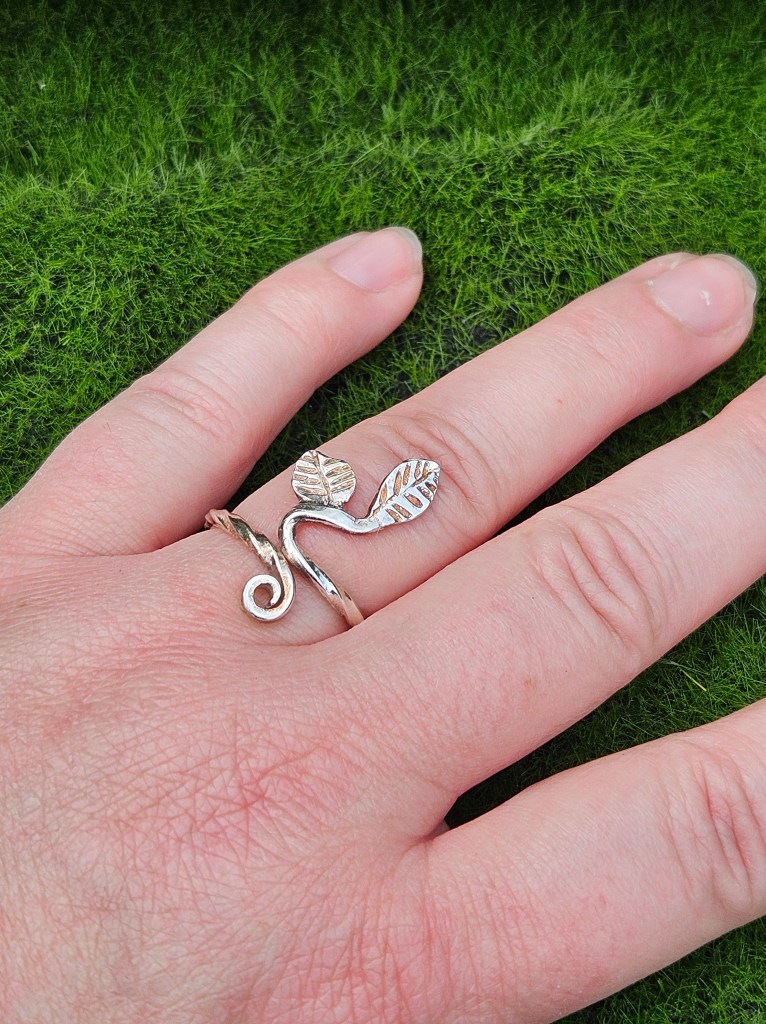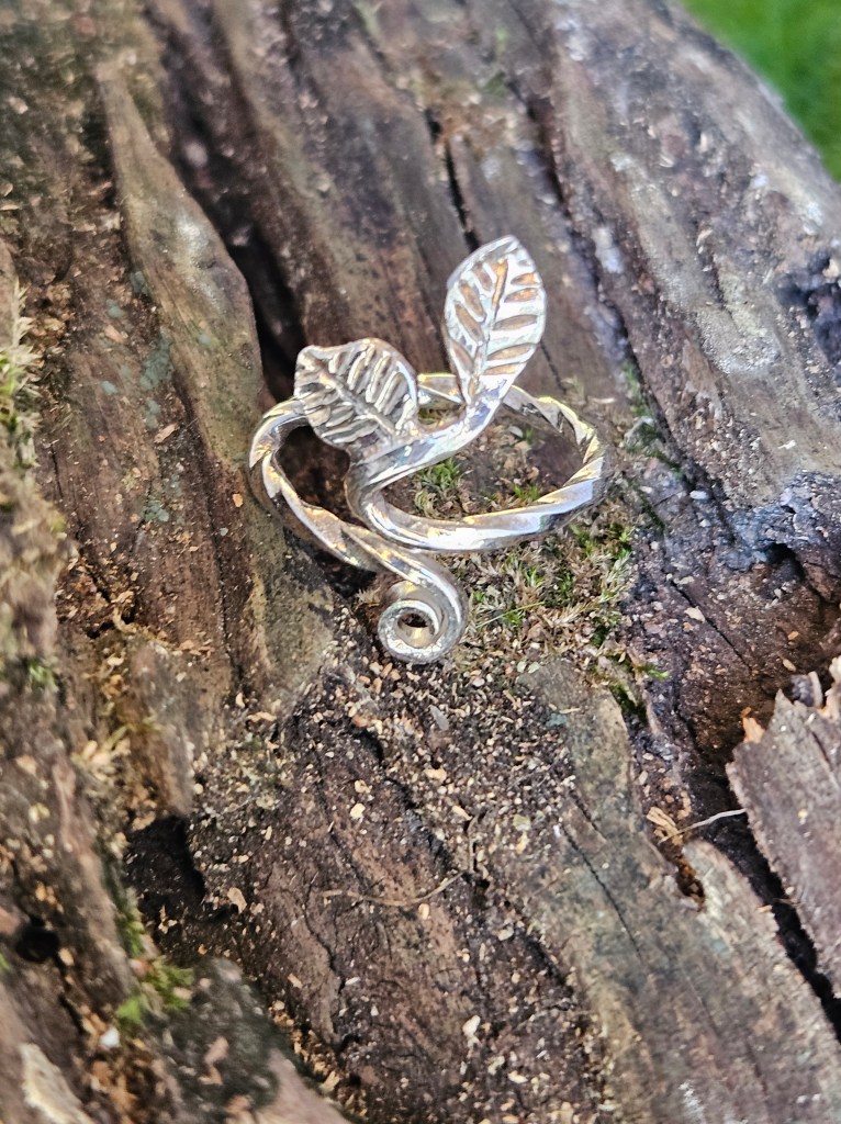 Leaf and Vine Ring Fabricated from 2mm sterling silver wire, a little tendril of vine wrapped around your finger. Finished: January 2025