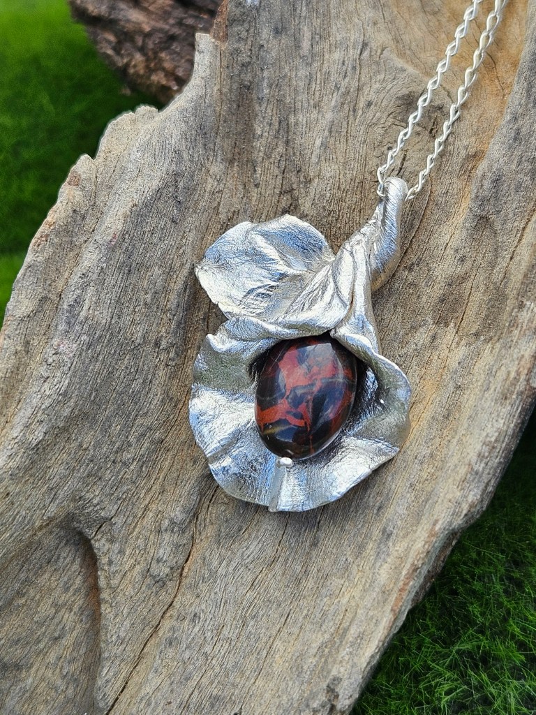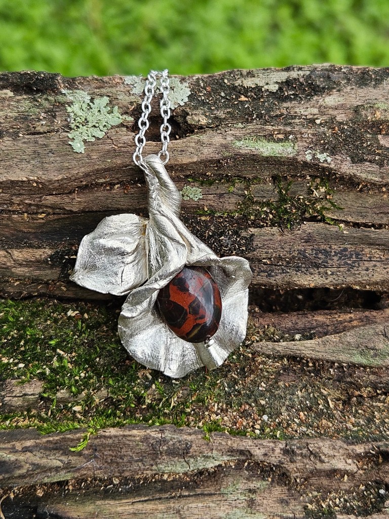 Mitsuro Hikime wax used in an entirely different way. Worked and stretched out like dough it can be stretched very thin to make lovely flower petals. This tube flower with leaf was then cast in sterling silver. A black and red jasper bead was then set in place.