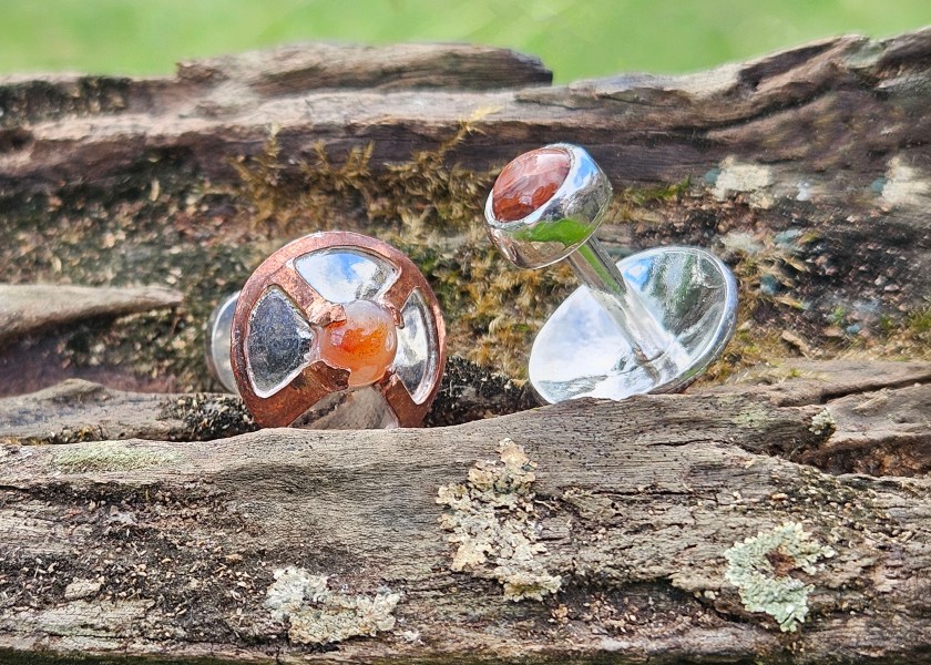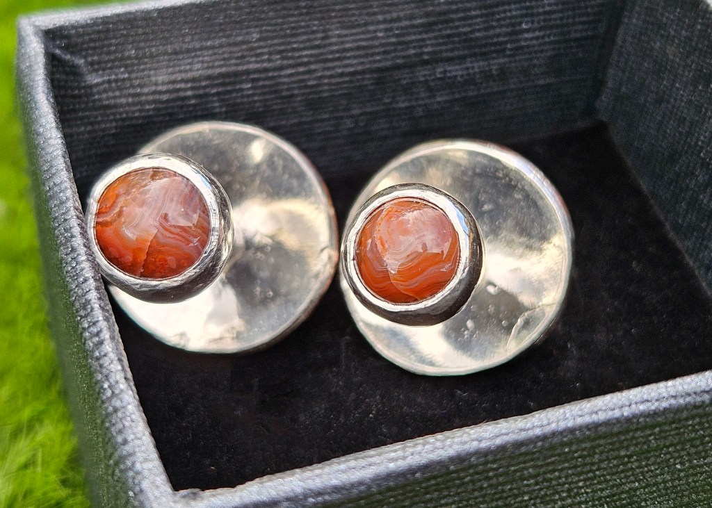 Hand fabricated from sterling silver and copper, these cufflinks have an agate shield boss as well as an agate backside. These agates are a little touch of home, collected from the shores of Lake Superior and shaped by a local lapidist.
