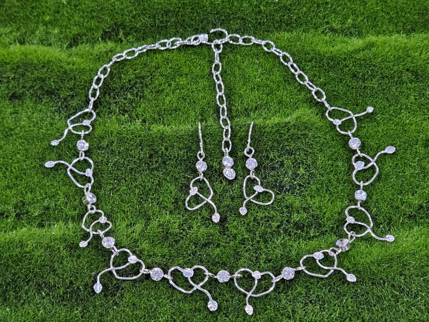 Made of sterling silver wire and sterling silver chenier set with ‘Hearts and Arrows’ clear cubic zirconia. Silver vines twisted into heart shapes with sparkling jewels joining them together to form this collar.